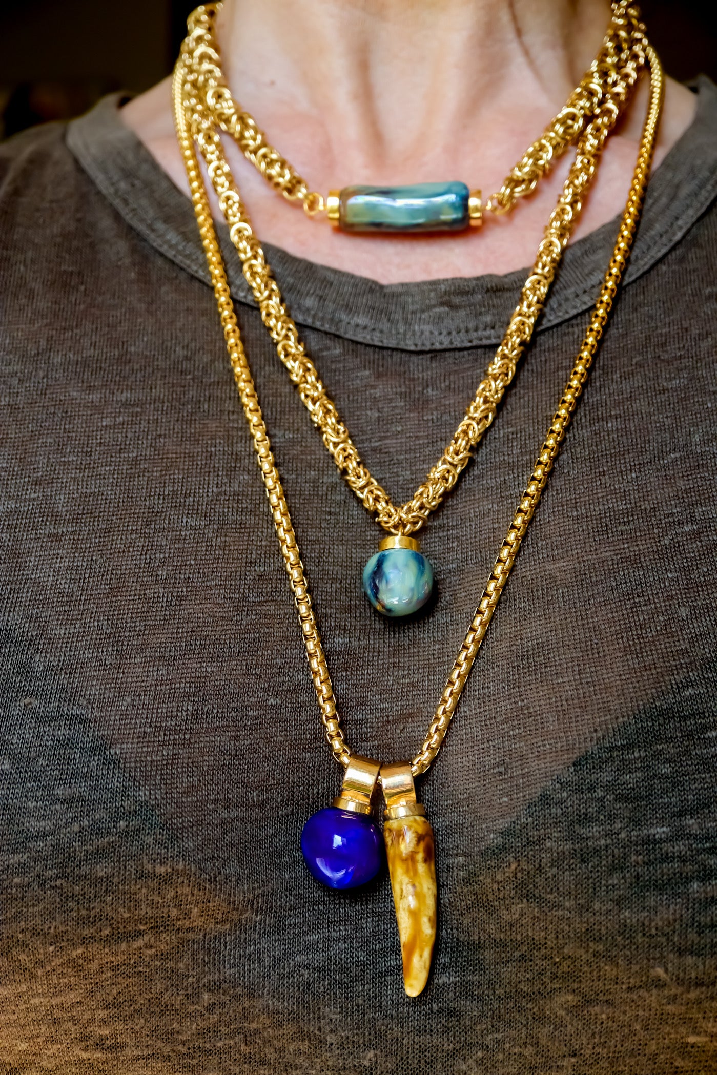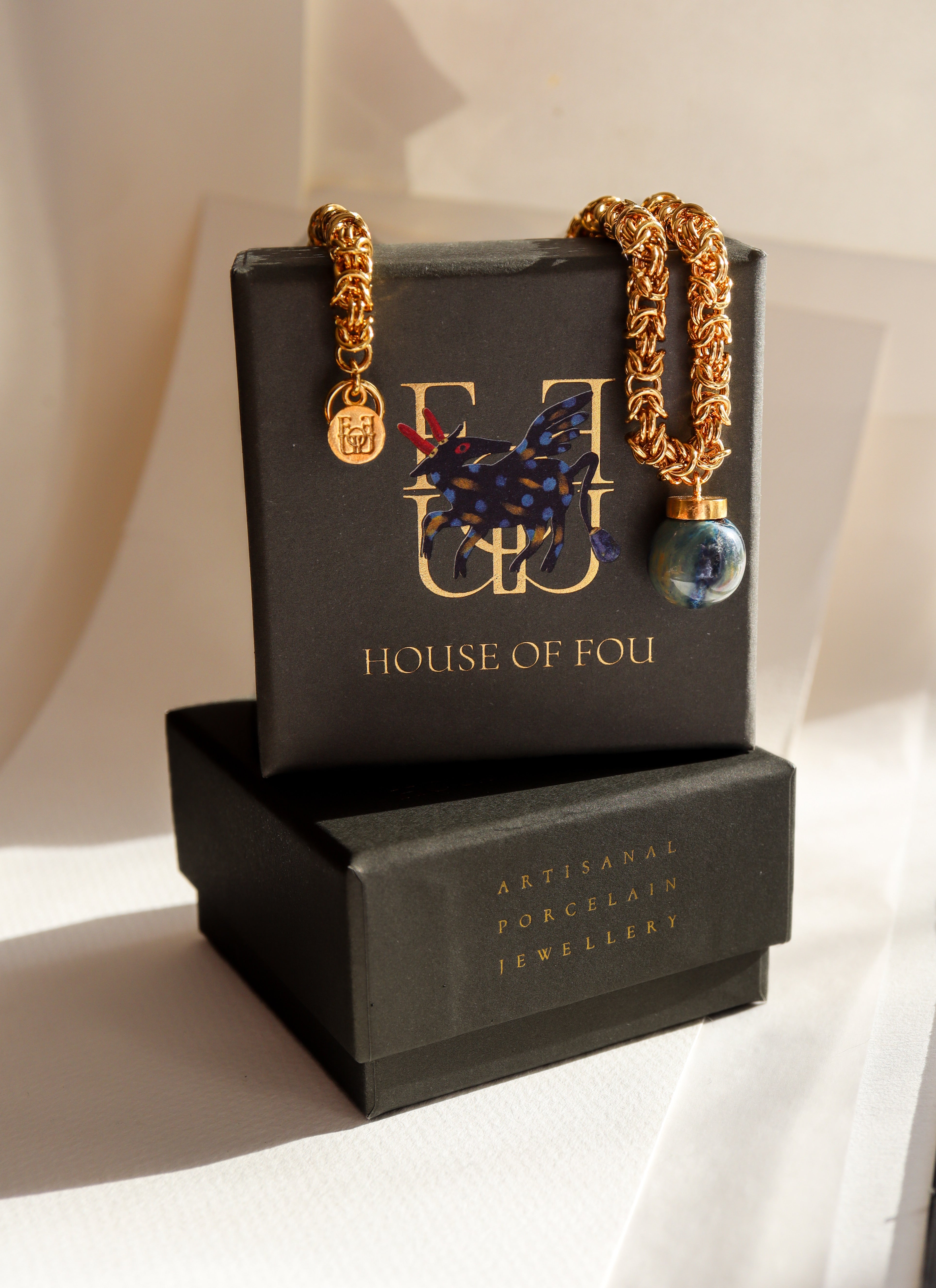 Ortasında el işçiliği porselen taş bulunan 22 ayar altın kaplama kolye.