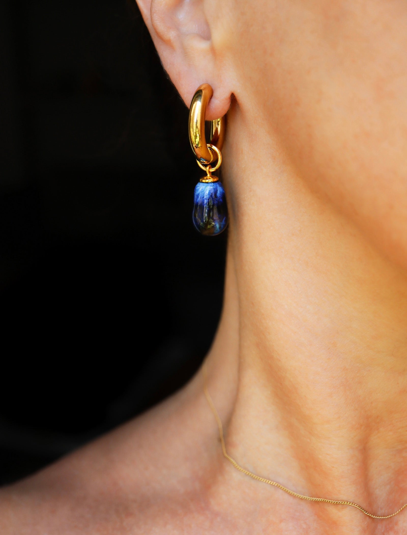 El işçiliği porselen damlalarla süslenmiş, 22 ayar altın kaplama kalın halka küpe.