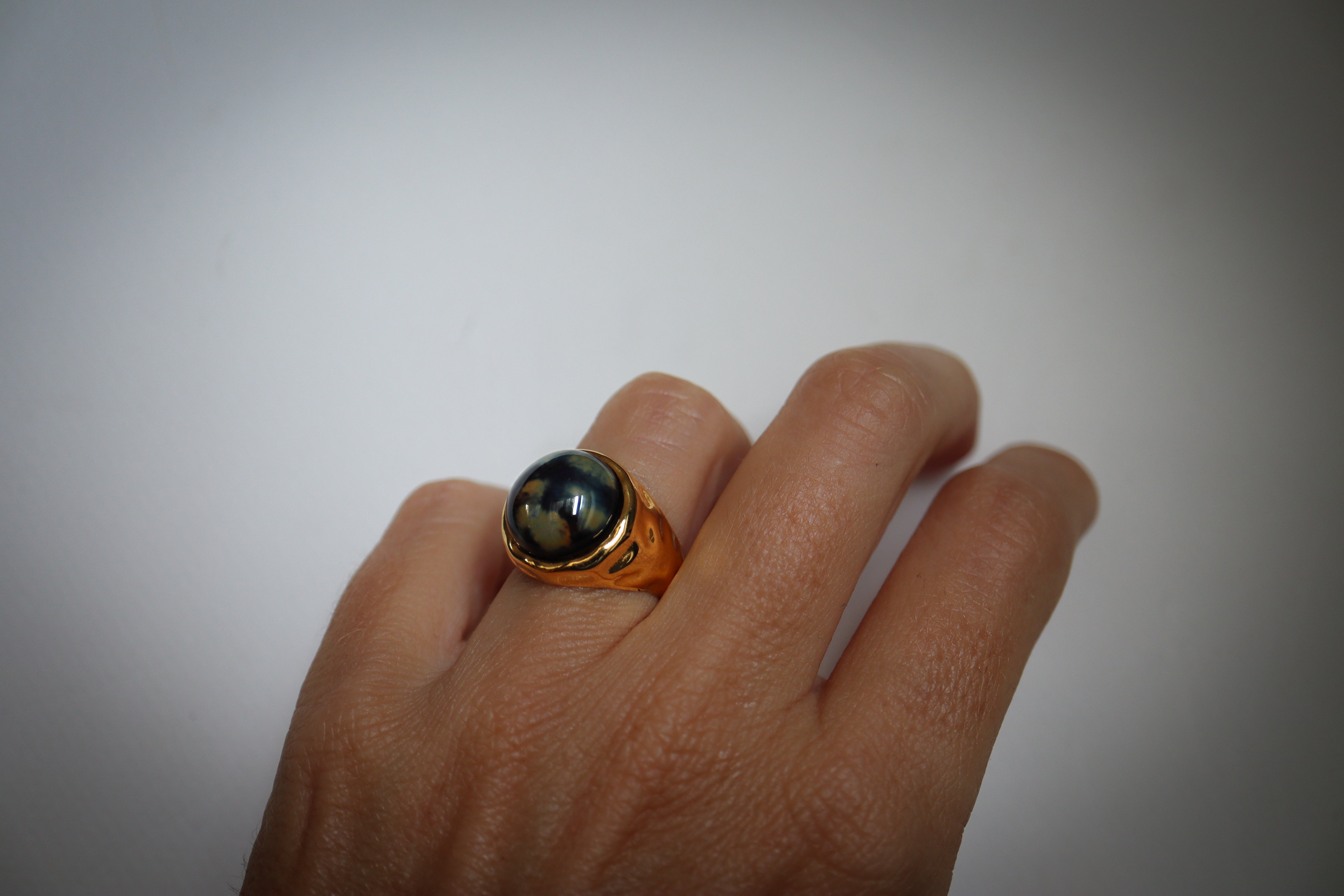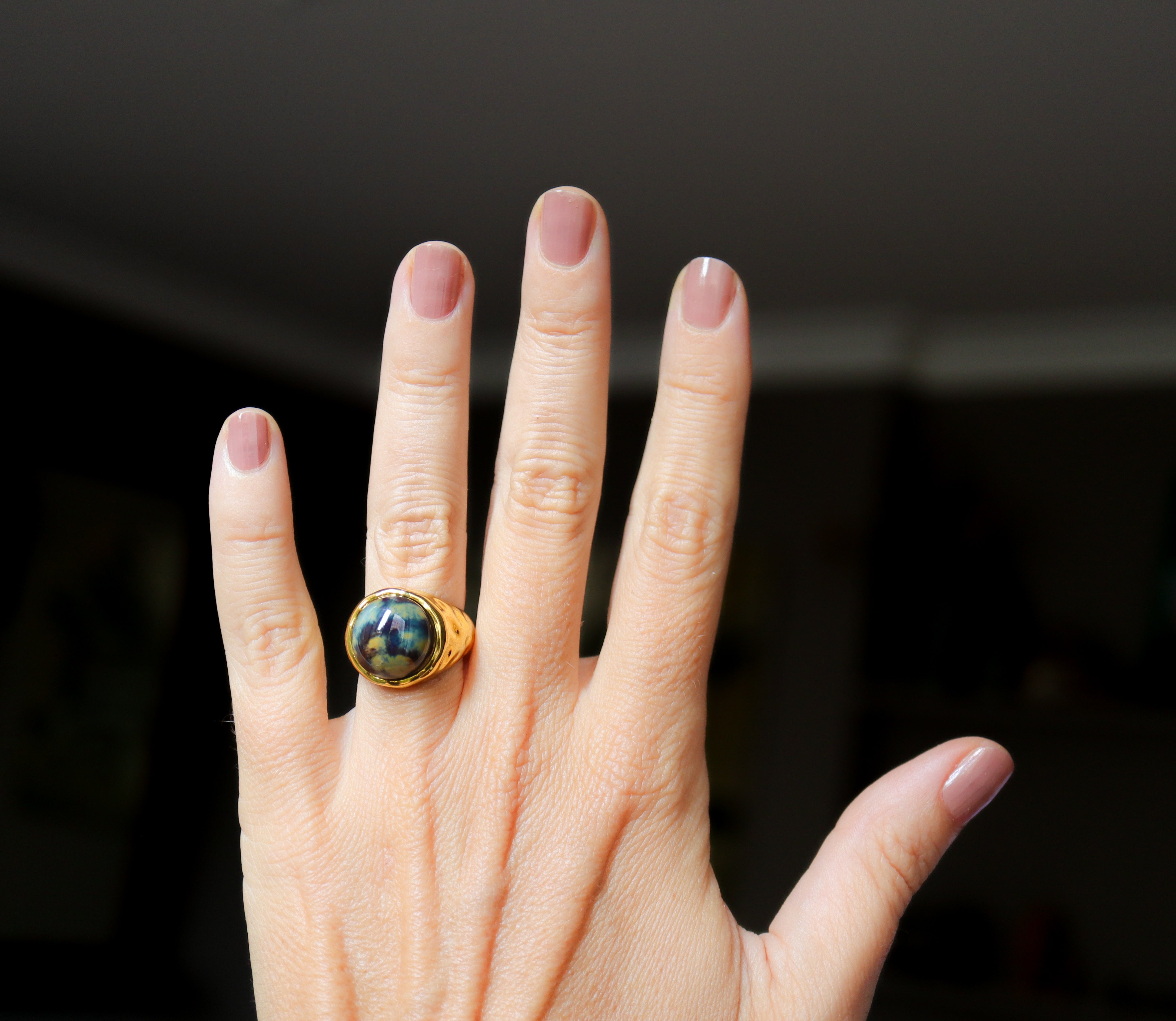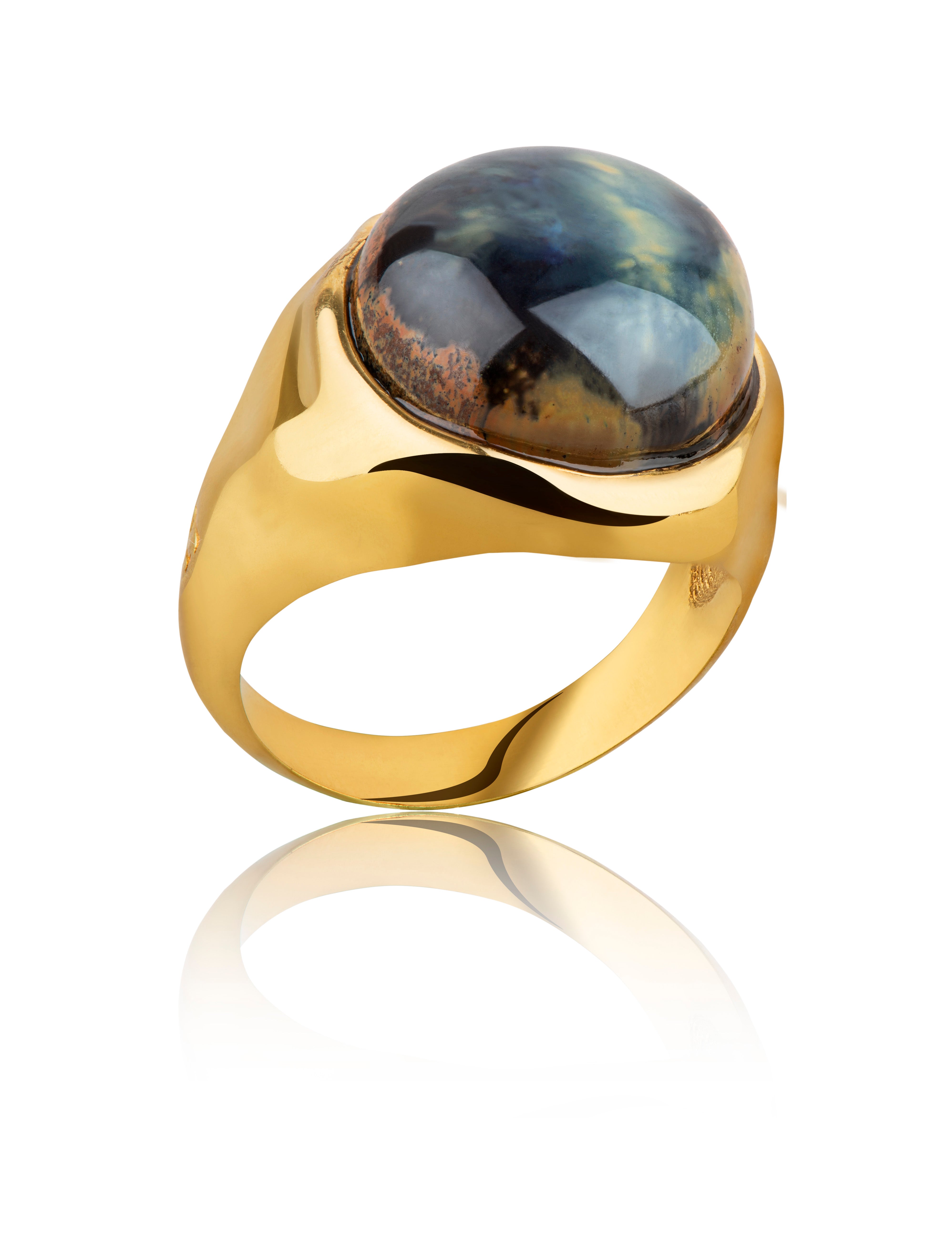 El işçiliği porselen taşlarla süslenmiş 22 ayar altın kaplama yüzük.